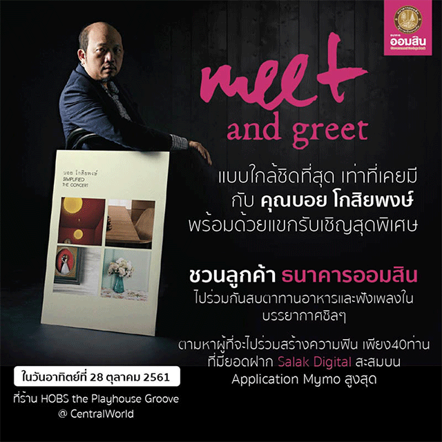 ชวนลูกค้าธนาคารออมสิน ไปร่วมกัน สบตา ทานอาหาร และฟังเพลงในบรรยากาศชิลๆ Meet & Greet แบบใกล้ชิดที่สุด เท่าที่เคยมี กับ คุณบอย โกสิยพงษ์ พร้อมด้วยแขกรับเชิญสุดพิเศษ ในวันอาทิตย์ที่ 28 ตุลาคม 2561 สถานที่ HOBS the Playhouse Groove @CentralWorld เพียง 40 ท่าน ที่มียอดฝาก Salak Digital สะสมบน Application MyMo สูงสุด