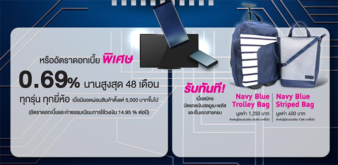 Umay+ จับมือ The Mall จัดโปรแรง ผ่อนสินค้า 0% นาน 20 เดือน หรือผ่อนสบายๆ กับดอกเบี้ยต่ำสุด 0.69% ทุกรุ่น ทุกยี่ห้อ ผ่อนต่ำสุดเพียง 400 บาท/เดือน ในงาน Power Mall Mobile IT Expo 2018 พิเศษ!!! สำหรับลูกค้าสมัครบัตรฯ ใหม่ และยื่นเอกสารครบ รับทันที กระเป๋า Navy Blue Trolley bag มูลค่า 1,250 บาท (สำหรับพนักงานประจำผู้มีฐานเงินเดือน 20,000 บาทขึ้นไป) หรือ กระเป๋า Navy Blue Striped bag มูลค่า 400 บาท (สำหรับพนักงานประจำผู้มีฐานเงินเดือน 7,000 บาทขึ้นไป) สมัครบัตรฯ และอนุมัติ สามารถผ่อนได้ทันที ตั้งแต่ 1 ก.ย. - 15 ต.ค. 61