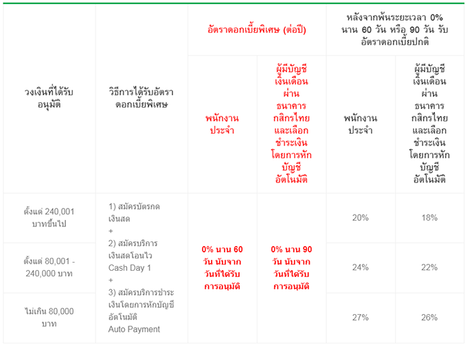 หมายเหตุ - สำหรับพนักงานประจำ ที่สมัครบัตรกดเงินสด K-Express Cash พร้อมสมัครบริการเงินสดโอนไว Cash Day 1 เพื่อโอนสินเชื่อตั้งแต่ 50% ขึ้นไป ของวงเงินที่รับอนุมัติเข้าบัญชีออมทรัพย์ธนาคารกสิกรไทยของผู้กู้