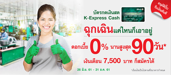 เงื่อนไขโครงการบัตรกดเงินสด K-Express Cash ดอกเบี้ย 0% นานสูงสุด 90 วัน - ลูกค้าที่เข้าร่วมโครงการ ต้องเป็นลูกค้าใหม่ ที่มีรายได้ประจำ หรือเป็นลูกค้าผู้มีบัญชีเงินเดือนผ่านธนาคารกสิกรไทย และยี่นสมัครบัตรกดเงินสด K-Express Cash (สินเชื่อเงินสดทันใจกสิกรไทย) ระหว่างวันที่ 26 มิ.ย. 61 - 31 ธ.ค. 61 และจะต้องได้รับอนุมัติภายในวันที่ 31 ม.ค. 62 เท่านั้น