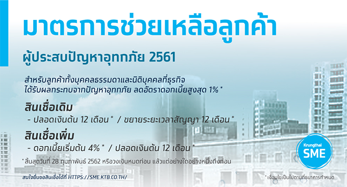 ลดอัตราดอกเบี้ยสูงสุด 1% เพื่อช่วยผู้ประสบปัญหาอุทกภัย 2561 มาตรการจากธนาคารกรุงไทย