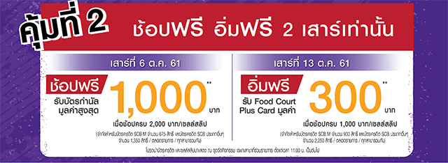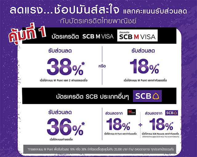 เงื่อนไขรายการส่งเสริมการขาย - สิทธิพิเศษสำหรับผู้ถือบัตรเครดิตไทยพาณิชย์ ("ผู้ถือบัตร") ทุกประเภท ยกเว้นบัตร SCB Family Plus เมื่อใช้จ่ายโดยแลกคะแนนสะสม M Point และคะแนนสะสม SCB Rewards เท่ายอดซื้อ ที่ห้างสรรพสินค้า เดอะมอลล์ ทุกสาขา, เอ็มโพเรียม, เอ็มควอเทียร์, พารากอน และบลูพอร์ต รวม เพาเวอร์มอลล์ กรูเมต์ มาร์เก๊ต และโฮม เฟรช มาร์ท ทุกสาขา ระหว่างวันที่ 5 - 14 ตุลาคม 2561