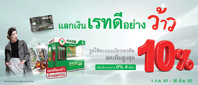 บัตรเครดิตกสิกรไทย ณ สำนักงานแลกเปลี่ยนเงินต่างประเทศ ที่ท่าอากาศยานสุวรรณภูมิ ดอนเมือง ภูเก็ต เชียงใหม่ และสาขาที่ร่วมรายการ รับสิทธิ์แบ่งจ่าย 0% นาน 4 เดือน ไม่ชาร์จเพิ่ม หรือเลือกใช้คะแนนบัตรเครดิตกสิกรไทย แลกรับส่วนลดสูงสุด 10%