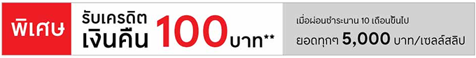 เงื่อนไขรับเครดิตเงินคืน - รับเครดิตเงินคืน 100 บาท เมื่อมียอดผ่อนชำระเครื่องใช้ไฟฟ้าและมือถือทุกๆ 5,000 บาท/เซลล์สลิป/ชิ้น นาน 10 เดือน ที่แผนกเครื่องใช้ไฟฟ้า เทสโก้ โลตัส สาขาที่ร่วมรายการ (เทสโก้ โลตัส เอ็กซ์ตร้า, เทสโก้ โลตัส ดีพาร์ทเม้นท์สโตร์ และ เทสโก้ โลตัสคุ้มค่า) ระหว่างวันที่ 1 ต.ค. 61 - 31 ธ.ค. 61