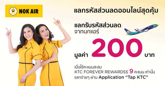 สิทธิพิเศษสำหรับสมาชิก บัตรเครดิต KTC บินนกแอร์ (Nok Air) แบบสุดคุ้ม แลกรับส่วนลด 200 ด้วยคะแนนสะสม KTC FOREVER REWARDS เพียง 9 คะแนน แลกง่ายๆ ผ่านแอปพลิเคชัน "Tap KTC"