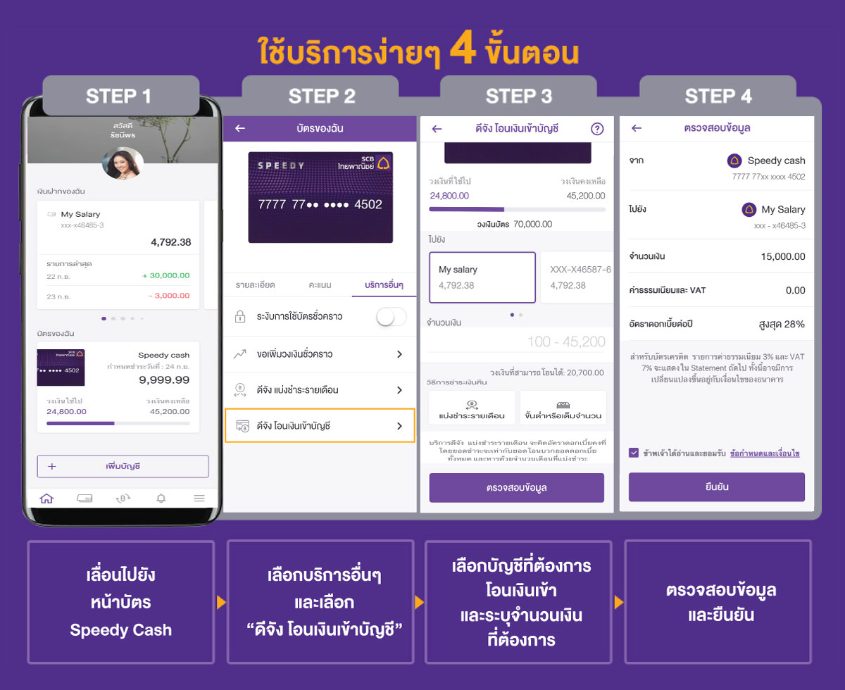 เพิ่มความคล่องตัวให้ชีวิต ด้วยบริการดีจัง โอนเงินเข้าบัญชี บริการที่ช่วยเปลี่ยนวงเงินคงเหลือในบัตร SCB Speedy Cash ของคุณเป็นเงินสด โอนเข้าบัญชีทันที ผ่าน SCB EASY APP