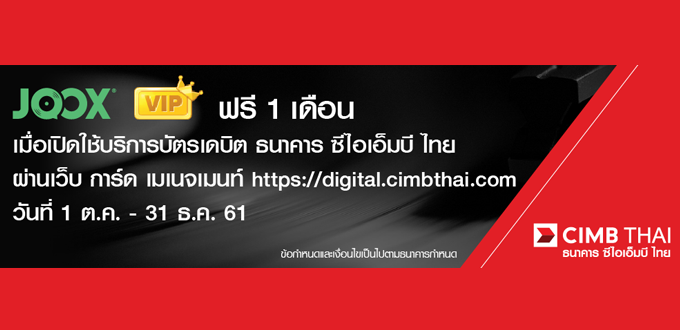 รับ Code JOOX VIP ฟรี 1 เดือน เมื่อเปิดใช้บริการบัตรเดบิต ธนาคาร ซีไอเอ็มบี ไทย