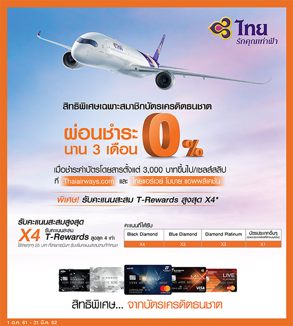 สิทธิพิเศษเฉพาะสมาชิกบัตรเครดิตธนชาต รับสิทธิ์ผ่อนชำระ 0% 3 เดือน เมื่อชำระค่าบัตรโดยสารการบินไทยตั้งแต่ 3,000 บาทขึ้นไป/เซลล์สลิป ที่ Thaiairways.com และ ไทยแอร์เวย์ โมบาย แอปพลิเคชัน
