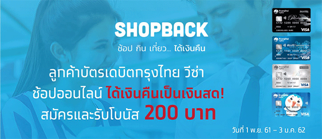 ลูกค้าบัตรเดบิตกรุงไทย วีซ่า ช้อปออนไลน์กับ Shopback ได้เงินคืนเป็นเงินสด! สมัครและรับโบนัส 200 บาท เมื่อสร้างบัญชีใช้งานกับ SHOPBACK ผ่าน