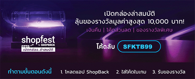 - ผู้ลงทะเบียนจะได้รับเงินคืน หรือ โค้ดส่วนลด หรือ ของรางวัลพิเศษ มูลค่าสูงสุด 10,000 บาท เข้าบัญชีของ SHOPBACK