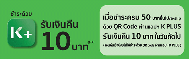 ชำระด้วย K PLUS รับเงินคืน 10 บาท เมื่อชำระครบ 50 บาทขึ้นไป/e-slip ด้วย QR Code ผ่านแอปพลิเคชัน K PLUS รับเงินคืน 10 บาท ในวันถัดไป (เงินจะคืนเข้าบัญชีที่ใช้ชำระด้วย QR Code ผ่านแอปพลิเคชัน K PLUS)