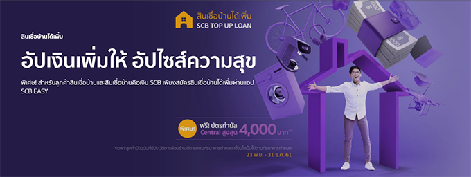 พิเศษ! สำหรับลูกค้าสินเชื่อบ้าน และสินเชื่อบ้านคือเงิน SCB เรามีความสุขเพิ่มให้ รับเงินเพิ่ม ผ่อนเท่าเดิม ไม่เพิ่มภาระ อนุมัติง่าย รู้ผลไว ผ่อนสบาย สูงสุด 30 ปี