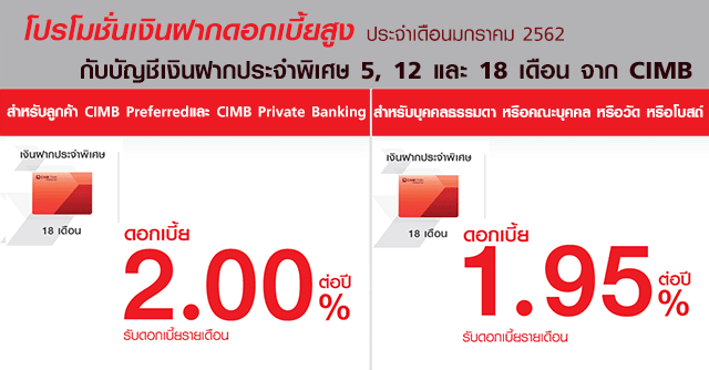 โปรโมชั่นบัญชีเงินฝากดอกเบี้ยสูงประจำเดือนมกราคม 2562 จาก ธนาคารซีไอเอ็มบี ไทย บัญชีเงินฝากประจำแบบมีกำหนดระยะเวลาที่ให้ดอกเบี้ยสูง และสามารถเลือกรับดอกเบี้ยแบบรายเดือน หรือเมื่อครบกำหนดได้