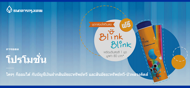 โปรโมชั่นพิเศษจาก ธนาคารกรุงเทพ ใครๆ ก็ออมได้ กับบัญชีเงินฝากสินมัธยะทรัพย์ทวี และสินมัธยะทรัพย์ทวี-บัวหลวงคิดส์ รับฟรี! ชุดกล่องใส่ดินสอ Blink Blink พร้อมดินสอสี 1 ชุด มูลค่า 80 บาท*