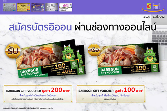 - ลูกค้าที่สมัครบัตรสมาชิกอิออนทุกประเภท (ยกเว้น บัตรสินเชื่อบิ๊กซี เอ็กซ์คลูซีฟ) ผ่านช่องทางออนไลน์ ระหว่างวันที่ 1 มกราคม - 31 มีนาคม 2562 รับบัตรกำนัล บาร์บีคิวพลาซ่า มูลค่า 100 บาท/บัตร เมื่ออนุมัติบัตร - บริษัทฯ จะทำการจัดส่งของสมนาคุณให้แก่ลูกค้าตามที่อยู่ในการจัดส่งใบแจ้งการชำระเงิน ภายใน 90 วัน หลังอนุมัติบัตร