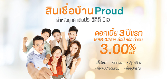 สินเชื่อบ้าน Proud สำหรับลูกค้าเดิมประวัติดี มีเฮ ดอกเบี้ย 3 ปีแรก MRR-3.75% ต่อปี หรือเท่ากับ 3.00% ต่อปี