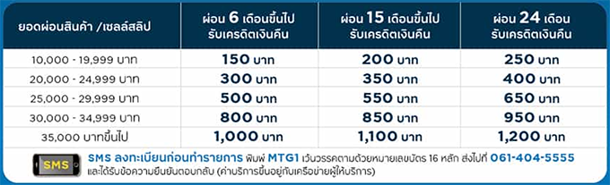 - ยอดเครดิตเงินคืนจะคำนวณยอดแบ่งจ่ายตั้งแต่ 10,000 บาทขึ้นไป / เซลล์สลิป และผ่อนชำระนาน 6 เดือนขึ้นไป