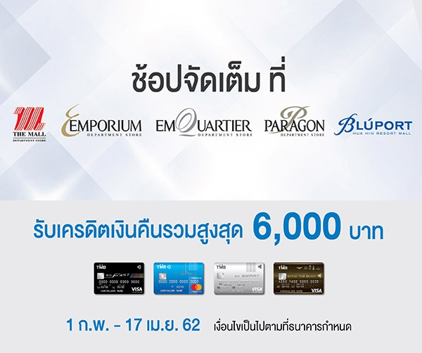 ช้อปจัดเต็ม!! กับบัตรเครดิตทีเอ็มบี เมื่อช้อปที่ห้างสรรพสินค้า เดอะมอลล์ทุกสาขา, เอ็มโพเรียม, เอ็มควอเทียร์, พารากอน และบลูพอร์ต รับเครดิตเงินคืนรวมสูงสุด 6,000 บาท