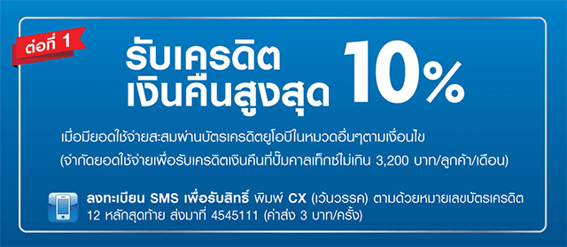 เงื่อนไขต่อที่ 2 แลกรับเครดิตเงินคืน 10% เมื่อใช้คะแนนสะสมทุก 800 คะแนน - รายการนี้ยกเว้นบัตรเครดิตยูโอบี โยโล่ แพลทินัม