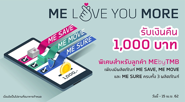 รายละเอียดโปรโมชั่น ME LOVE YOU MORE - สำหรับลูกค้า ME by TMB ที่มีบัญชี ME SAVE บัญชี ME MOVE และประกัน ME SURE ครบ 3 ผลิตภัณฑ์ ตั้งแต่วันที่ 15 ก.พ. - 15 เม.ย. 62 จะได้รับเงินคืนเข้าบัญชี ME SAVE 1,000 บาท โดยต้องชำระเงินค่าเบี้ยประกัน ME SURE ขั้นต่ำ 25,000 บาทขึ้นไป ระหว่างวันที่ 15 ก.พ. - 15 เม.ย. 62 และกรมธรรม์ต้องได้รับการอนุมัติภายในวันที่ 30 เม.ย. 62 และมีผลบังคับจนถึงวันที่คืนเงินเข้าบัญชี