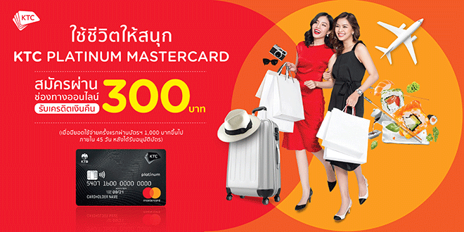 บัตรเครดิต KTC PLATINUM MASTERCARD วันนี้! *รับเครดิตเงิน 300 บาท เมื่อสมัครผ่านช่องทางออนไลน์ที่กำหนด พร้อมดาวน์โหลด KTC mobile และมียอดใช้จ่ายตั้งแต่ 1,000 บาทขึ้นไป 1 ครั้ง ภายใน 45 วันหลังจากได้รับการอนุมัติบัตรฯ