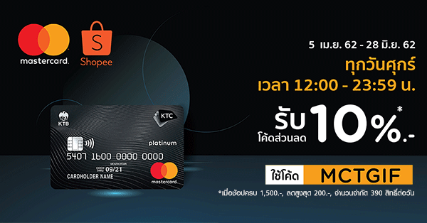 1. ศุกร์พิเศษ สัมผัสประสบการณ์ช้อปออนไลน์สุดคุ้มกับ KTC MASTERCARD >> รับโค้ดส่วนลด 10% เพียงใช้โค้ด MCTGIF และชำระด้วยบัตรเครดิต KTC MASTERCARD ตั้งแต่ 1,500 บาทขึ้นไป