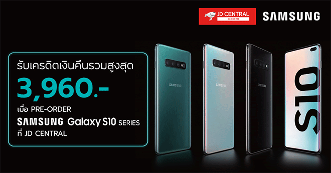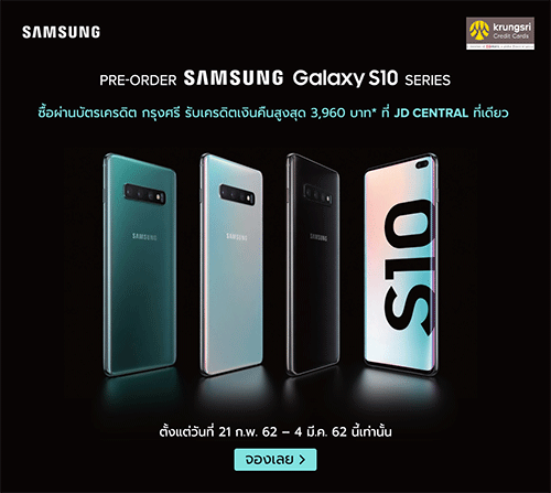 ลูกค้าที่ถือบัตรเครดิตกรุงศรี จอง Samsung Galaxy S10 ผ่าน JD Central รับเครดิตเงินคืนรวมสูงสุด 3,960 บาท* พร้อมสิทธิพิเศษอื่นๆ