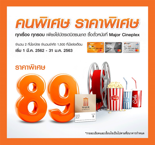 ดูหนังราคาพิเศษ 89 บาท ทุกเรื่อง ทุกรอบ เมื่อใช้บัตรเดบิตธนชาต ซื้อตั๋วหนังที่ Major Cineplex
