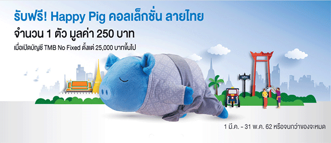 โปรโมชั่นใหม่จากทีเอ็มบี...ลูกค้าใหม่ที่เปิดบัญชี TMB No Fixed ตั้งแต่ 25,000 บาทขึ้นไป รับฟรี! Happy Pig คอลเล็กชั่น ลายไทย จำนวน 1 ตัว มูลค่า 250 บาท
