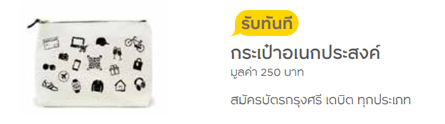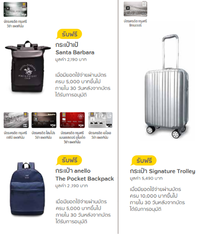 - สิทธิพิเศษเฉพาะสมาชิกบัตรหลักใหม่ที่ได้รับอนุมัติบัตร ตั้งแต่ 1 ก.พ. - 31 พ.ค. 62 และมีการใช้จ่ายสะสมผ่านบัตรหลักครบ 5,000 บาทขึ้นไป (เฉพาะบัตรเครดิตกรุงศรี ซิกเนเจอร์ 10,000 บาทขึ้นไป) ภายใน 30 วัน หลังจากบัตรได้รับการอนุมัติ