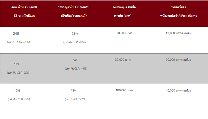 - รับดอกเบี้ย 18% ต่อปี นาน 12 รอบบัญชีแรก รอบบัญชีที่ 13 เป็นต้นไป ปรับเป็นอัตราดอกเบี้ย 24% ต่อปี สำหรับลูกค้าที่มีรายได้รวม 20,000 บาทต่อเดือน