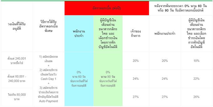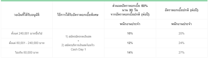 - หลังจากสิ้นสุดระยะเวลาส่วนลดอัตราดอกเบี้ย 50% นาน 30 วันแล้ว อัตราดอกเบี้ยจะถูกปรับเป็นอัตราดอกเบี้ยปกติตามวงเงินที่ลูกค้าได้รับอนุมัติ