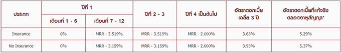 - กรณีสมัครทำประกันชีวิต (MRTA) ต้องสมัครทำประกันชีวิตขั้นต่ำ 70% ของวงเงินสินเชื่อ ระยะเวลาความคุ้มครองขั้นต่ำ 10 ปี หรือ สูงสุดไม่เกินระยะเวลากู้ กรณีกู้ไม่ถึง 10 ปี