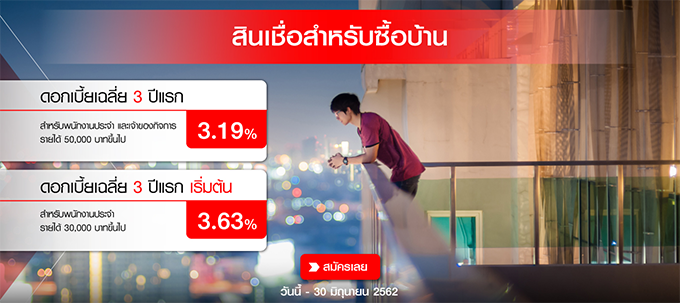 สินเชื่อสำหรับซื้อบ้าน - ดอกเบี้ยเฉลี่ย 3 ปีแรก 3.19% สำหรับพนักงานประจำ และเจ้าของกิจการ รายได้ 50,000 บาทขึ้นไป