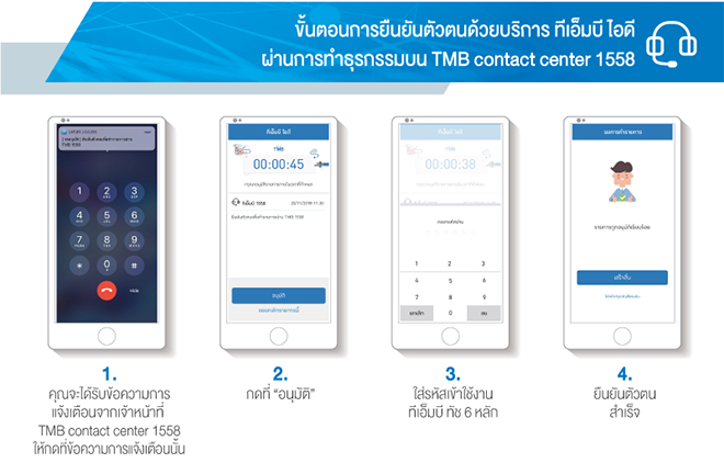 ยืนยันตัวตนรูปแบบใหม่ ผ่านบริการ TMB ID ช่วยให้ทำธุรกรรมผ่าน TMB Contact Center 1558 ได้อย่างรวดเร็ว และปลอดภัยมากยิ่งขึ้น โดยไม่ต้องตอบคำถามอีกต่อไป เพียงสมัครบริการ TMB ID เพื่อใช้ในการยืนยันตัวตน สามารถใช้บริการได้ทุกวัน ตลอด 24 ชม.