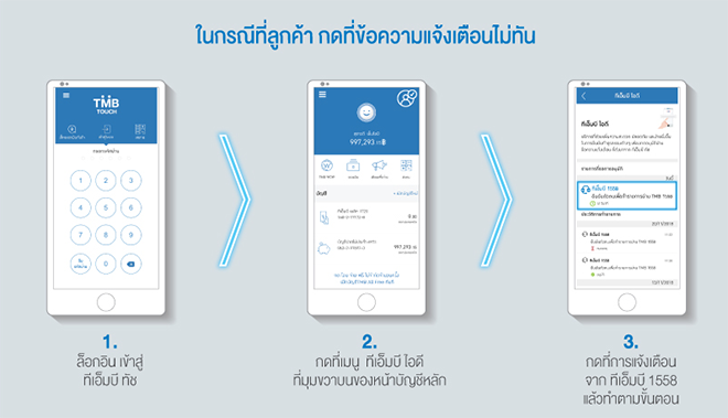 *สำหรับกรณีที่โทรศัพท์มือถือไม่รองรับการใช้งาน ทีเอ็มบี ทัช สามารถสมัครบริการ Contact Center Pin ได้ที่ช่องทาง TMB Contact Center 1558 โดย