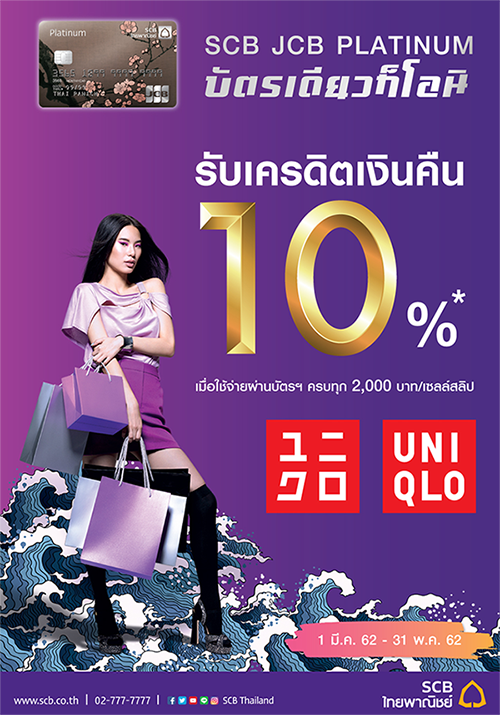 บัตรเครดิต SCB JCB PLATINUM ให้คุณรับเครดิตเงินคืน 10% ที่ Uniqlo เมื่อใช้จ่ายผ่านบัตรฯ ครบทุก 2,000 บาท/เซลล์สลิป