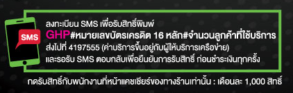 เงื่อนไขและข้อกำหนด - ผู้ถือบัตรต้องลงทะเบียน เพื่อรับสิทธิ์ส่วนลดทาง SMS โดยพิมพ์ GHP # หมายเลขบัตรเครดิต 16 หลัก # จำนวนลูกค้าที่ใช้บริการ ส่งไปที่ 4197555 (ค่าบริการขึ้นอยู่กับผู้ให้บริการเครือข่าย) และรอรับ SMS ตอบกลับเพื่อยืนยันการรับสิทธิ์ ก่อนชำระเงินทุกครั้ง (ค่าลงทะเบียนขึ้นอยู่กับผู้ให้บริการเครือข่าย)