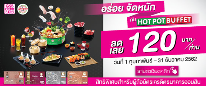 สิทธิพิเศษ! สำหรับลูกค้าบัตรเครดิตธนาคารออมสิน รับส่วนลด 120 บาท/ท่าน เมื่อรับประทานอาหารที่ร้าน Hot Pot Buffet ทุกสาขา วันที่ 1 กุมภาพันธ์ - 31 ธันวาคม 2562