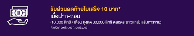 เงื่อนไขรับส่วนลดท้ายใบเสร็จ 10 บาท - สิทธิพิเศษสำหรับลูกค้าที่ใช้บริการฝากและถอนเงินสดผ่านบัญชีธนาคารไทยพาณิชย์ จำกัด (มหาชน) ที่เคาน์เตอร์เซอร์วิสในร้าน 7-Eleven ตั้งแต่วันที่ 29 มีนาคม 2562 ถึง 30 มิถุนายน 2562 มีสิทธิ์ได้รับคูปองส่วนลดท้ายใบเสร็จมูลค่า 10 บาท เพื่อใช้เป็นส่วนลดสำหรับการซื้อสินค้าที่ร่วมรายการในร้าน 7-Eleven ณ สาขาที่ร่วมรายการ