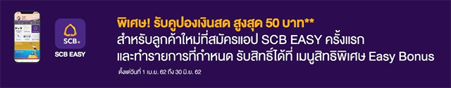 เงื่อนไขสำหรับลูกค้าที่สมัครใช้แอปฯ SCB EASY สำเร็จเป็นครั้งแรกและทำธุรกรรมที่ 7-Eleven - สิทธิพิเศษสำหรับลูกค้าที่สมัครใช้แอปฯ SCB EASY สำเร็จเป็นครั้งแรก รับคูปองเงินสด 7-Eleven มูลค่า 10 บาท ผ่านทางเมนูสิทธิพิเศษ Easy Bonus ใน แอปฯ SCB EASY ภายใน 24 ชม. หลังจากสมัครใช้บริการสำเร็จ ระหว่างวันที่ 1 เมษายน 2562 - 30 มิถุนายน 2562 โดยจะต้องเป็นลูกค้าที่สมัครแอปฯ SCB Easy สำเร็จเป็นครั้งแรก โดยจะต้องไม่เป็นการยกเลิกการใช้บริการแอปฯ SCB Easy ที่ใช้อยู่ก่อนแล้วเพื่อสมัครใหม่