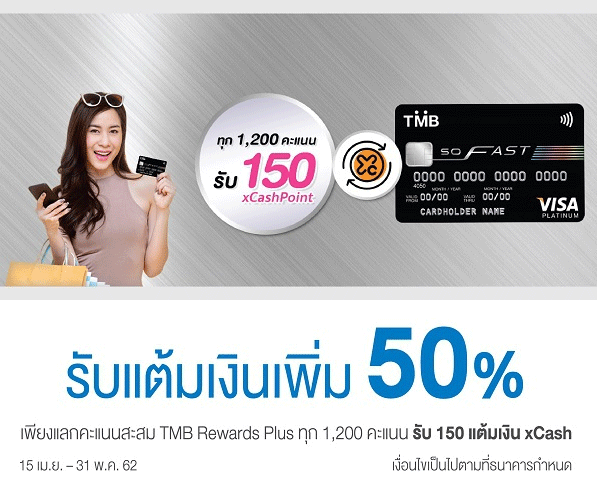 โปรโมชั่นจากบัตรเครดิตทีเอ็มบี - ยิ่งแลก ยิ่งคุ้ม กับ xCash แลกคะแนนสะสม TMB Rewards Plus รับแต้มเงินเพิ่ม 50% สามารถใช้แลกแทนเงินสดได้มากกว่าถึง 300 ร้านค้า เพียงแลกคะแนนสะสม TMB Rewards Plus ทุก 1,200 คะแนน รับ 150 แต้มเงิน xCash (1 xCash เท่ากับ 1 บาท) ง่ายๆ เพียงโหลดแอปฯ xCash พร้อมลงทะเบียนเบอร์โทรศัพท์