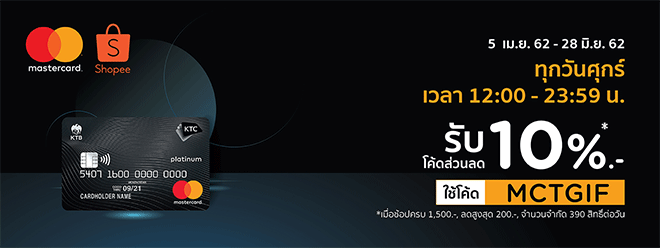 ศุกร์พิเศษ ช้อปออนไลน์สุดคุ้มที่ Shopee กับ KTC MASTERCARD รับโค้ดส่วนลด 10% เพียงใช้โค้ด MCTGIF และชำระด้วยบัตรเครดิต KTC MASTERCARD ตั้งแต่ 1,500 บาทขึ้นไป