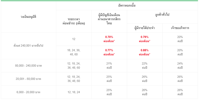 *ลูกค้าผู้มีบัญชีเงินเดือนผ่านธนาคารกสิกรไทยที่ได้รับอนุมัติวงเงินตั้งแต่ 240,001 บาทขึ้นไป รับดอกเบี้ยพิเศษต่ำสุด 0.70% ต่อเดือน และ 0.77% ต่อเดือน เป็นแบบอัตราคงที่แบบประมาณการ (flat rate) โดยคำนวณจากอัตราดอกเบี้ยแบบลดต้นลดดอก (Effective Rate) ในอัตรา 15% ต่อปี และ 16% ต่อปี โดยมีระยะเวลาการผ่อนชำระ 12 และ 60 เดือน ตามลำดับ และลูกค้าผู้มีรายได้ประจำที่ได้รับอนุมัติวงเงินตั้งแต่ 240,001 บาทขึ้นไปรับดอกเบี้ยพิเศษต่ำสุด 0.79% ต่อเดือน และ 0.88% ต่อเดือน เป็นแบบอัตราคงที่แบบประมาณการ (flat rate) โดยคำนวณจากอัตราดอกเบี้ยแบบลดต้นลดดอก (Effective Rate) ในอัตรา 17% ต่อปี และ 18% ต่อปี และมีระยะเวลาการผ่อนชำระ 12 และ 60 เดือน ตามลำดับ