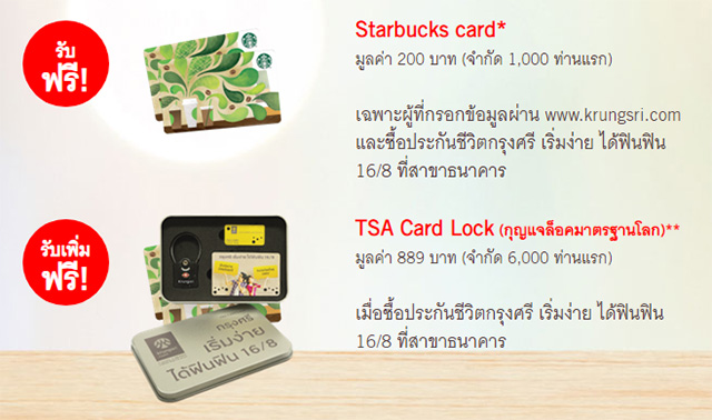 *เงื่อนไขรับ Starbucks card - สำหรับผู้ที่กรอกข้อมูลผ่าน www.krungsri.com และซื้อผลิตภัณฑ์กรุงศรี เริ่มง่าย ได้ฟินฟิน 16/8 (เฉพาะชำระเบี้ยรายปี) ของบมจ.อลิอันซ์ อยุธยาประกันชีวิต หรือ บมจ.ไทยประกันชีวิต ผ่านสาขาธนาคารกรุงศรีอยุธยา ตั้งแต่วันที่ 22 เม.ย. 62 - 31 พ.ค. 62 และกรมธรรม์ได้รับการอนุมัติภายในวันที่ 30 มิ.ย. 62 (จำกัด 1,000 ท่านแรก)