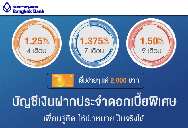 บัญชีเงินฝากประจำดอกเบี้ยพิเศษ เพื่อนคู่คิด ให้เป้าหมายเป็นจริงได้ กับบัญชีเงินฝากประจำ 4 เดือน 7 เดือน และ 9 เดือน รับฝากตั้งแต่ 2,000 บาทขึ้นไป ที่ธนาคารกรุงเทพทุกสาขา