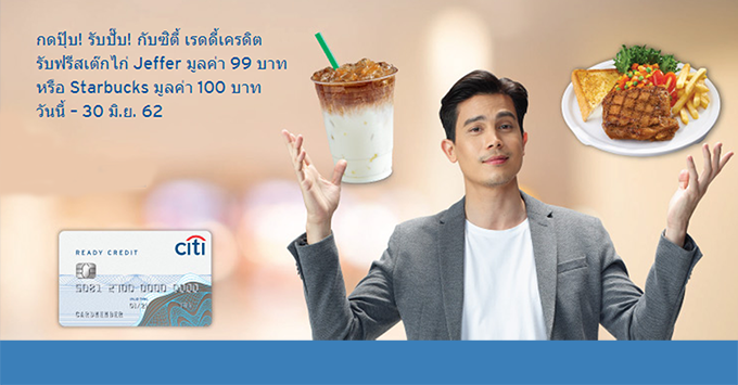 เงื่อนไขธนาคารซิตี้แบงก์ - สมาชิกบัญชีซิตี้ เรดดี้เครดิต รับฟรี Jeffer Spicy Chicken (สเต๊กไก่เจฟเฟอร์) 1 จาน มูลค่า 99 บาท ที่ร้าน Jeffer หรือ E-Coupon มูลค่า 100 บาท ที่ร้าน Starbucks