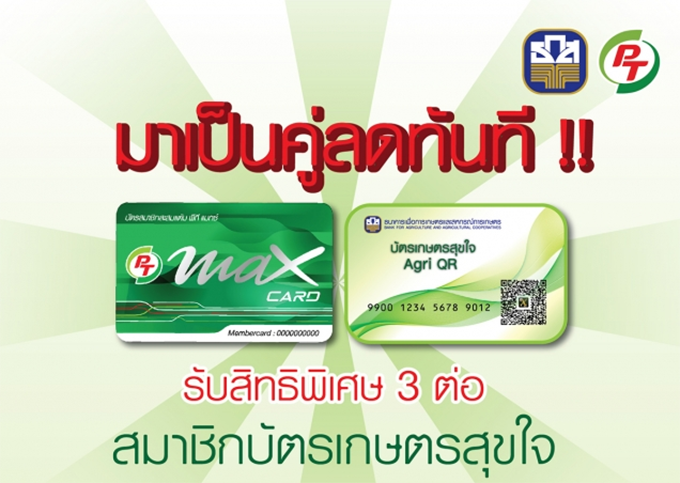 เพียงใช้บัตรเกษตรสุขใจ พร้อมแสดงบัตรสมาชิก พีที แมกซ์ การ์ด ตั้งแต่วันนี้ - 30 มิถุนายน 2562
