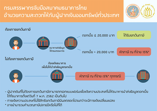 นายปรีดี ดาวฉาย ประธานสมาคมธนาคารไทย เปิดเผยเพิ่มเติมว่า "การกำหนดให้ธนาคาร ผู้จ่ายดอกเบี้ยนำส่งข้อมูลดอกเบี้ยทุกบัญชีต่อกรมสรรพากร จะเป็นประโยชน์ต่อลูกค้าบัญชีเงินฝากส่วนใหญ่ของประเทศ อย่างไรก็ตาม สำหรับลูกค้าที่ไม่ประสงค์จะใช้สิทธิดังกล่าว และไม่ต้องการให้ธนาคารผู้จ่ายดอกเบี้ยนำส่งข้อมูลดอกเบี้ยให้กรมสรรพากร ต้องกรอกแบบฟอร์มเพื่อแจ้งความประสงค์ที่ธนาคารผู้จ่ายดอกเบี้ย ที่ลูกค้ามีบัญชีให้ครบทุกธนาคาร ตั้งแต่วันที่ 7 พฤษภาคม 2562 เป็นต้นไป โดยการแจ้งครั้งเดียวจะมีผลตลอดไป จนกว่าลูกค้าจะมาแจ้งเปลี่ยนแปลงเป็นอื่น ทั้งนี้ ลูกค้าที่มาแจ้งภายในวันที่ 14 พฤษภาคม 2562 จะมีผลตั้งแต่รอบภาษีดอกเบี้ยจ่ายครึ่งปีแรกในเดือนมิถุนายนเป็นต้นไป"