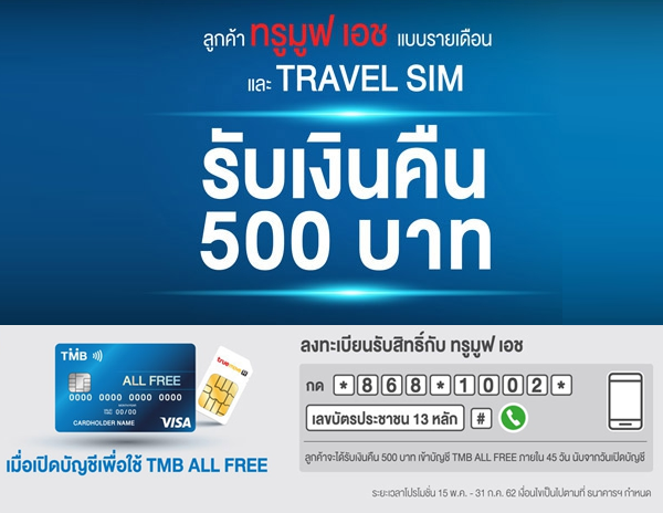 รายละเอียดโปรโมชั่น - สำหรับลูกค้า ทรูมูฟ เอช แบบรายเดือน และ ทรูมูฟ เอช TRAVEL SIM ที่เปิดบัญชี TMB ALL FREE พร้อมบัตรเดบิต ระหว่างวันที่ 15 พ.ค. - 31 ก.ค. 62 ที่สาขา TMB ทั่วประเทศ ธนาคารฯ จะทำรายการคืนเงิน 500 บาท เข้าบัญชี TMB ALL FREE ของลูกค้า ภายใน 45 วัน นับจากวันเปิดบัญชี TMB ALL FREE และเปิดใช้งานบริการตามเงื่อนไขโปรโมชั่น